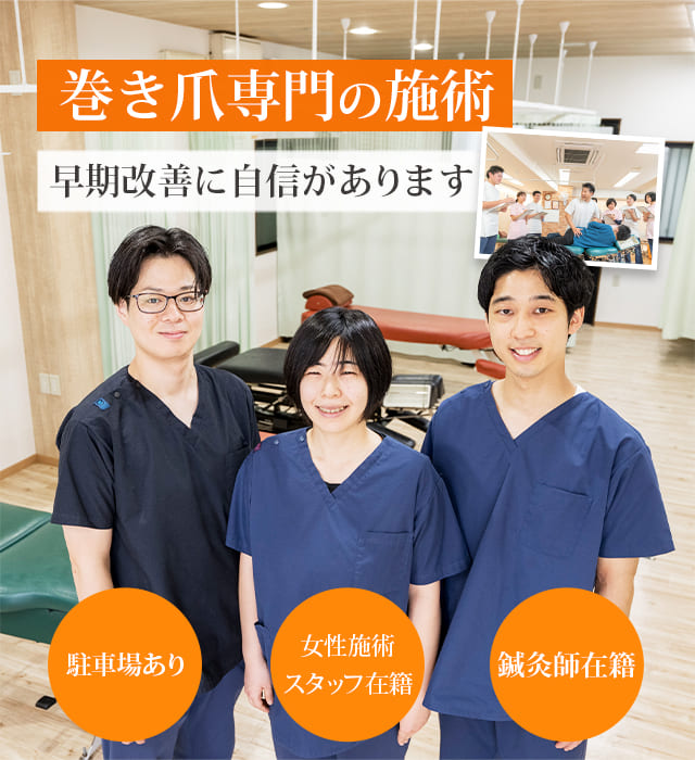 そこで当院では、ワイヤー等の矯正だけでは良くならない「巻き爪」に対して、痛みの少ない巻き爪の矯正と、手技と器具を組み合わせた姿勢を整える矯正、足のトラブルにアプローチする施術、巻き爪を再発させないための歩き方の指導を行います。